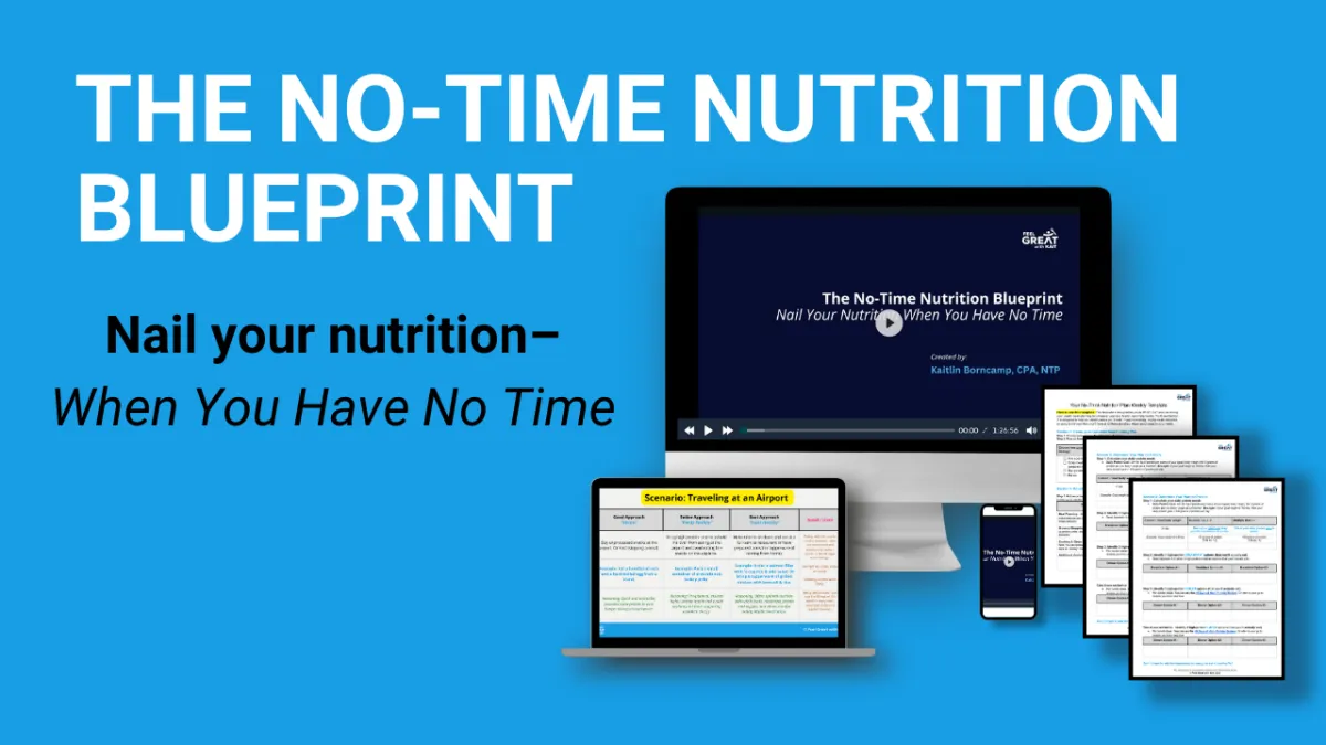 Try the No-Time Nutrition Blueprint for 7 days. Use it, apply it, and if you don’t think it’s worth every penny, simply send one email to kaitlin(@)feelgreatwithkait.com, show me you tried it, and I’ll refund you 100%—no hassle.